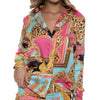 Let your imagination roam freely as you cause a stir among vacationers with this bold, eclectic mishmash of gold paisley, big cat print and posh pink pizazz. It's a look that evokes timeless elegance and trendsetting uniqueness. Our classy, pull-on crop top has a scoop neck and short sleeves. Pair the top with the sensational long skirt, which has teasing peek-a-boo side cut-outs and chunky golden chains.