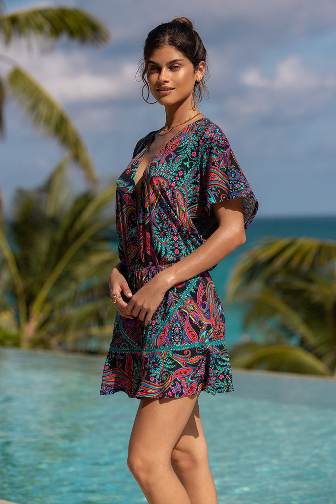 This boho inspired print will electrify all your summer vibes. Luxe stitch details trim these stylish pieces and bold colors illuminate the print. Resortwear beautifully completes all your summer looks that will get everyone saying "QUE LINDA"!