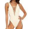 This one-piece swimwear from our Desert Star Collection makes an elegant impression. The basket-weave texture and creamy ivory color highlight your summer glow while open sides and cross-laced plunging V neckline accentuate your figure. Adjust the side laces for your preferred fit.