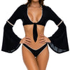 This high-cut swimwear from our Midnight Dreaming Collection spices up your summer wardrobe. Suede-like black fabric swings to life on a sexy Cuba Libra crop top with a front bow tie at the plunging V neckline, neck string ties and dramatic bell sleeves. High-cut bikini bottoms with contrast stitching rock any poolside party.