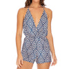 • Plunging neckline with halter top that ties at the neck for an adjustable fit