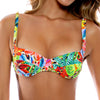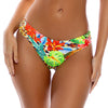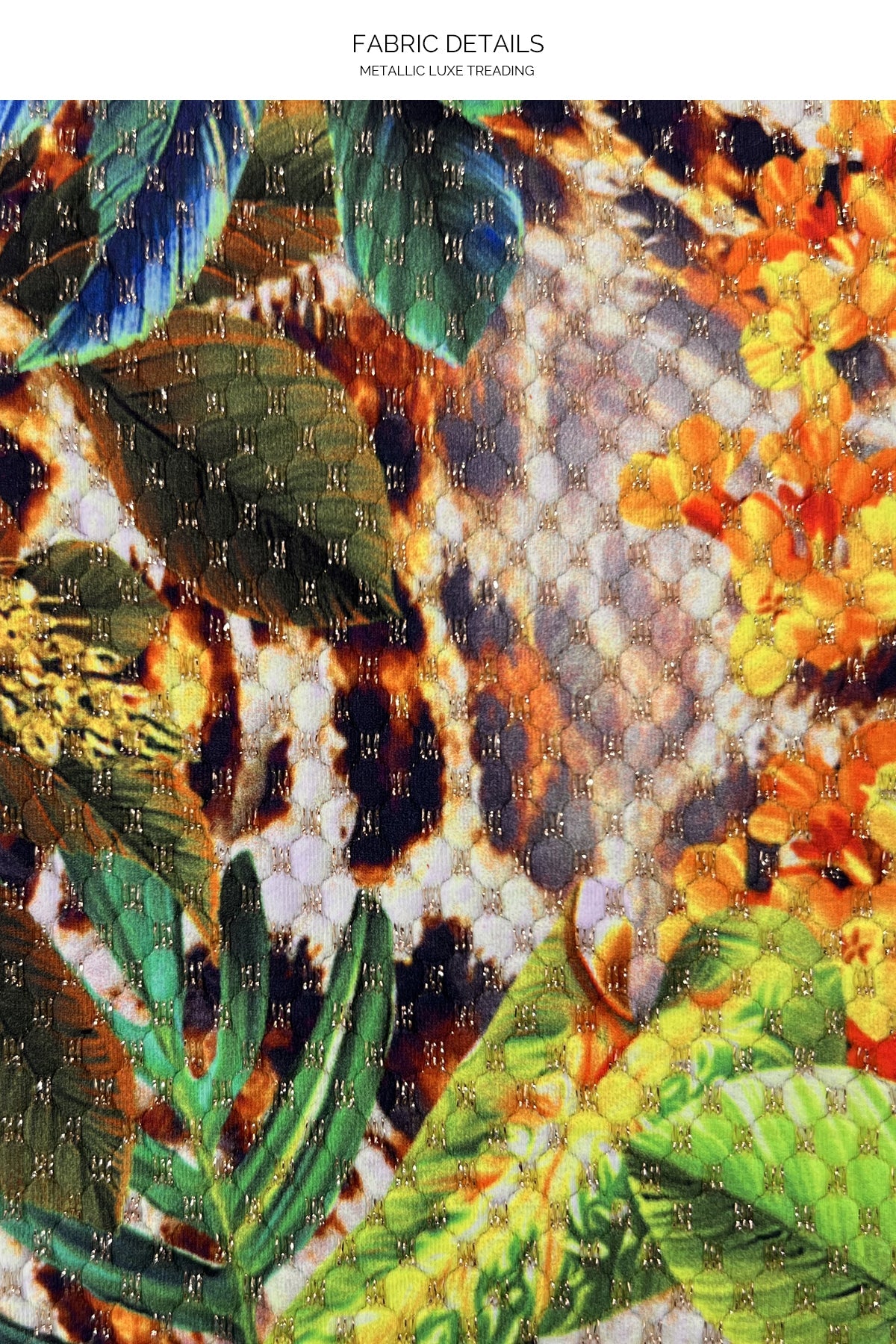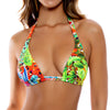 Go on the vacation adventure of a lifetime knowing that you look magnificent in this Lush Horizons tropical-inspired bikini. The exotic print features a medley of bright, bold colors and lush florals that evoke the beauty of nature. Have fun wearing the seamless, reversible top with the print and gleaming gold fabric. The Brazilian-style bottom is also reversible, giving you several options for creating an exciting swimwear look.