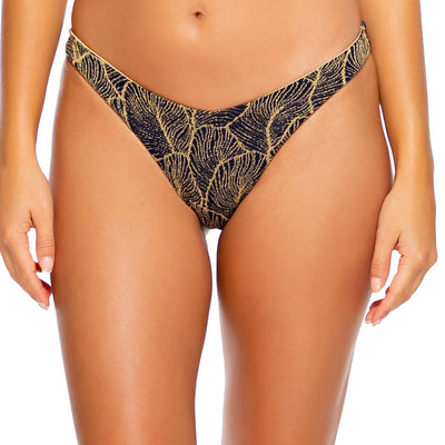 This Brazilian bikini from the Dreamweaver Collection amps up your cheeky swimwear wardrobe. The V neckline adds drama while a supportive thin band at the breast line gives you an extra push. The wavy ruched back bikini bottom is accented with delicate gold rings.