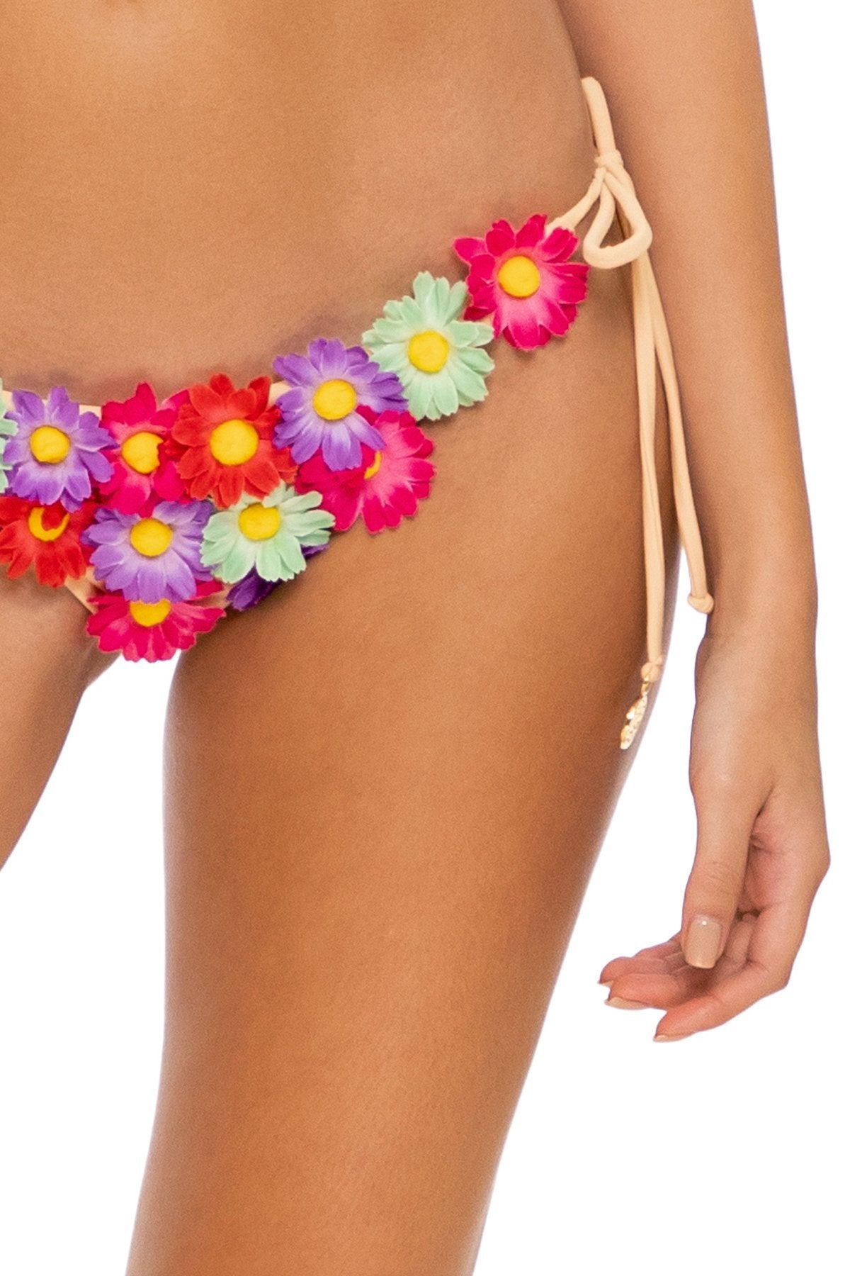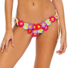 This full coverage bikini from our Pretty Things Collection lets you blossom on the beach or poolside. 3D flower accents bloom on the front of the classic triangle top and Brazilian bottoms. Full coverage bikini bottom has tan-highlighting solid nude back.