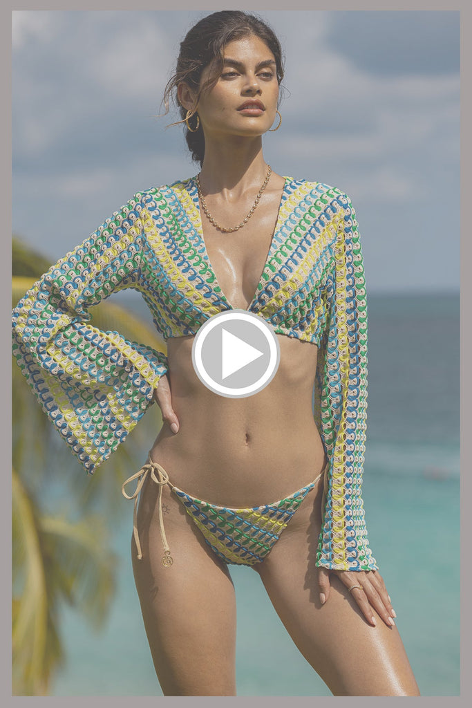 Luli Babes, it's time to go bold with something uniquely different. This Island Blues two-piece swimwear pairs a long-sleeved crop top with a figure-flattering bottom for a memorable vacation-ready outfit. The on-trend top features roomy bell sleeves that flow in the breeze as you move about. Center ties with Luli Rings make it easy to adjust the fit to your liking.
