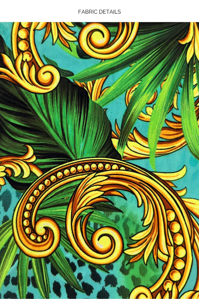 Embody the natural beauty of lush, tropical islands with a bikini that pays homage to palm trees swaying in the tropical breeze. If you love green, this swimwear look is for you. The opulent, exotic pattern showcases shades of green with yellow florals providing pops of color. Feel comfortable moving freely in a halter top that provides full coverage and has thick shoulder straps. The bikini bottom, which matches, features a seamless front and flirty puckering on the back.