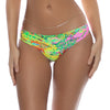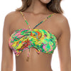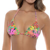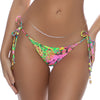 Luli Babes, things are getting a little hot around here. We're talking about this sexy bikini with a versatile, multi-way style. You get to enjoy two looks with the same bikini, and the first awesome option is the vibrant multicolored print that showcases your creative vibe and cheekiness with a revealing keyhole top and strappy backside. Whenever you desire, you can wear the top three unique ways. And when you want more versatility, you can reverse the top and bottom pieces and enjoy wearing a bright yellow bikini look.
