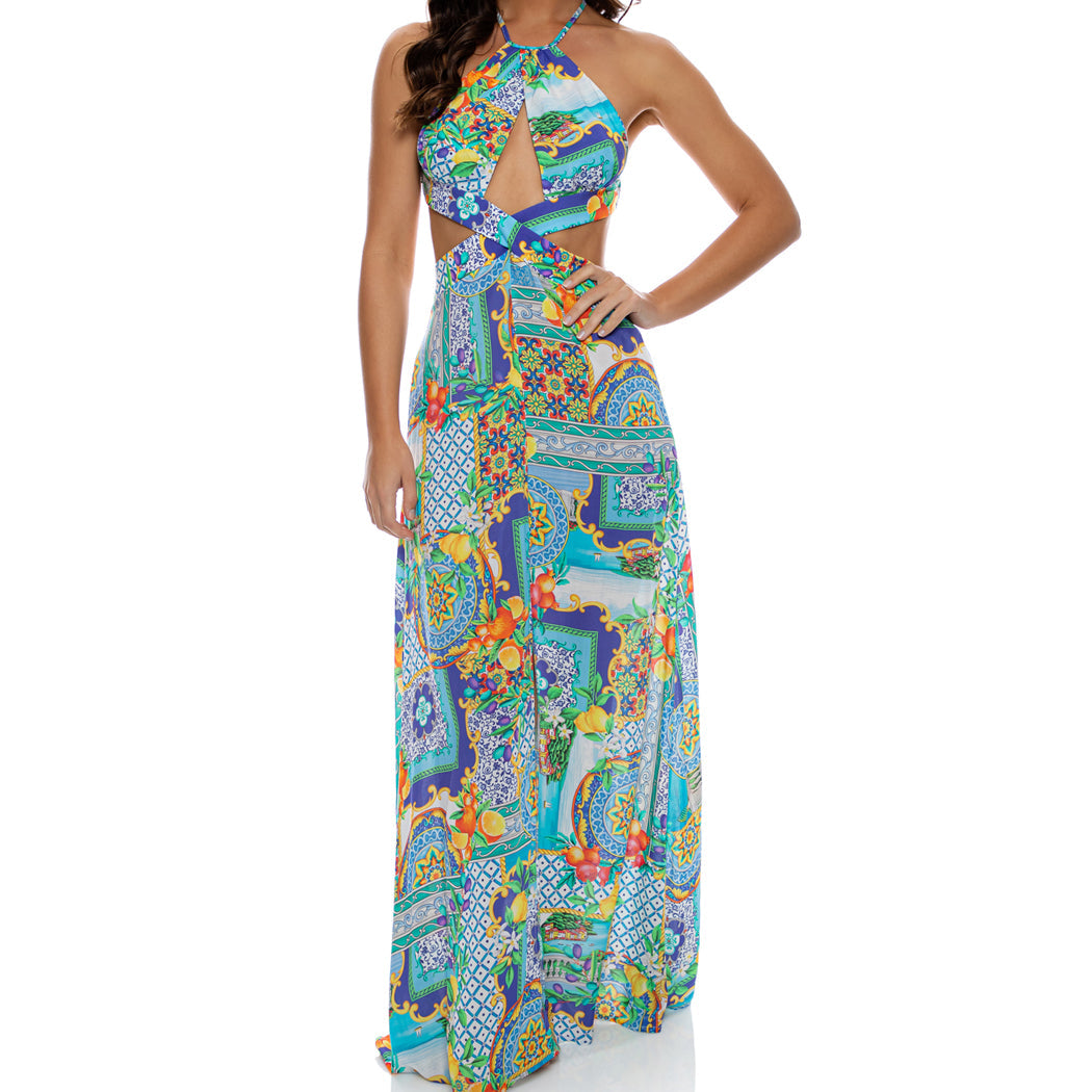 - A Fierce Maxi Style For Any Occasion - Center Cut Out Detail - String Ties Lace Up In The Back For An Adjustable Fit - Can Be Tighten To Your Own Comfort - Side Cut Outs For A Sexy Tropical Look - Flowy Maxi Skirt With A Slit Detail Allows You To Show Off Your Figure - Prints Are Not Exact And May Vary According To Cut - 100% Viscose