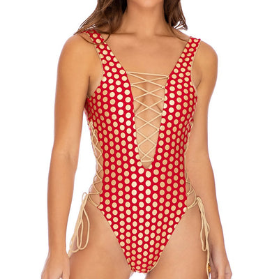 Slay your vacay look in an eye-catching one-piece style with the Dotted Delight Open Side One-Piece Bodysuit from Luli Fama. This swim style fuses glam and sex appeal with lace-up string ties finished in classic Luli gold rings, so you feel extra amazing the next time you hit the pool or beach.