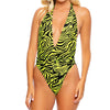 This Fierce Call one-piece bodysuit lets you dive into hot style. The plunging neckline points toward the knotted front detail at the waist. High-cut bikini bottoms flatter most figures while offering moderate coverage in a bright animal print.