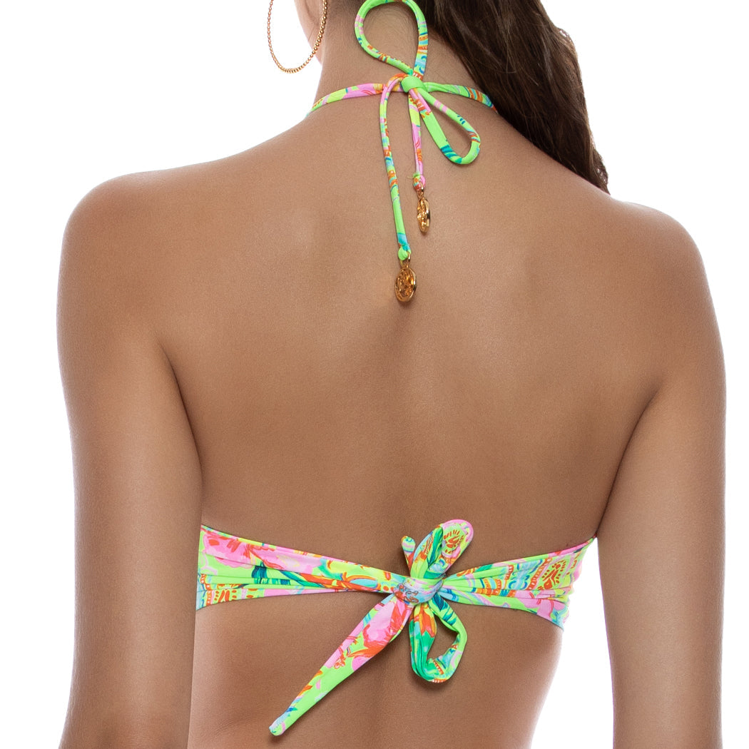 - Bandeau Style Cups - Intertwined Crossed String With Ring Detail In The Front - Halter Style Allow For Better Support - Ties At The Back For An Adjustable Fit - String Ties Completed With Our Signature Luli Rings - Textured Fabrics Bring Out The Prints Floral Details - Prints Are Not Exact And May Vary According To Cut - 83% Polyamide 10%lurex7%spandex