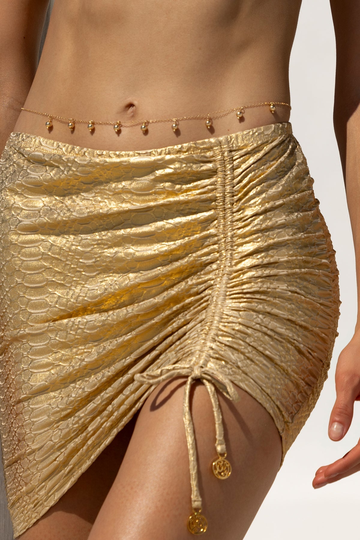 Embrace your glamorous side, Luli Babes, with this captivating Medusa bikini top and mini skirt combination made with our signature gold. With your every move, the gleaming embellished metallic fabric shimmers with brightness. Textured accents give the fabric an intriguing mysteriousness that only adds to its overall allure. Meanwhile, the halter top provides full cup coverage for your bountiful bosom. Our sizzling hot golden scrunch skirt includes adjustable ties with signature Luli Rings for added customization.