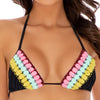 - Bikini top and pants are delicately trimmed in tri-color pom-pom details