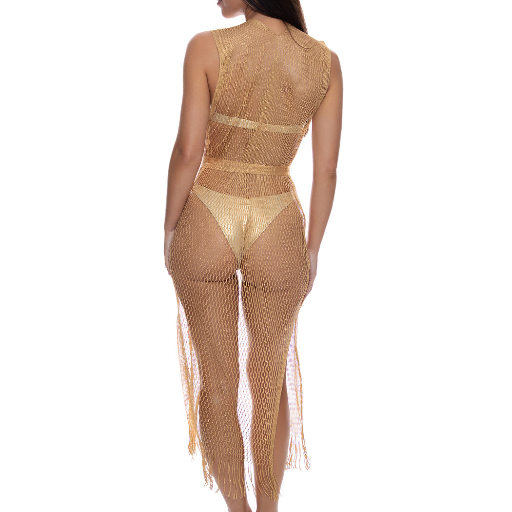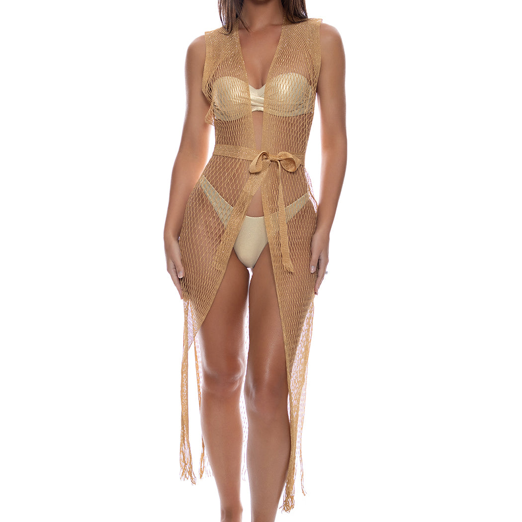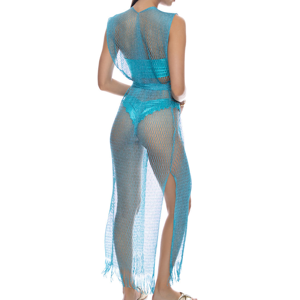 - Trendy Open-front Poncho Dress That Doubles As A V-neck Beach Cover Up - Sheer Design So You Can Show Off Your Suit Underneath - Shimmery Fabrics Beautifully Compliment Any Luli Kini - Waist Tie And Leg Slits On Both Sides Of Fringe Skirt For Comfy Fit And Movement - Maxi Style Length Completed By Fringe Trim - Available In One Size, Which Fits Most
